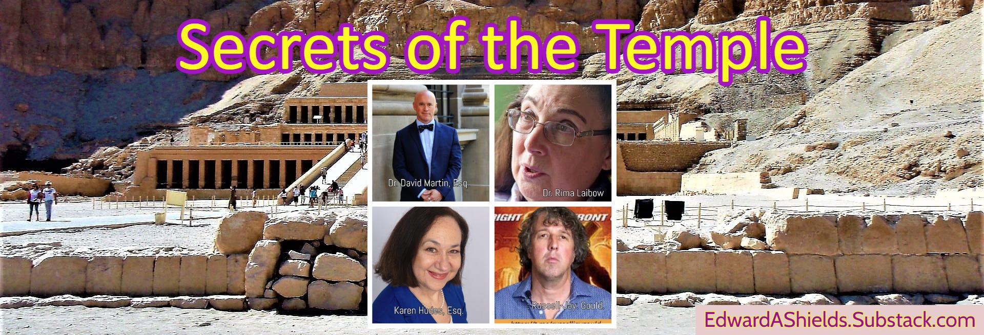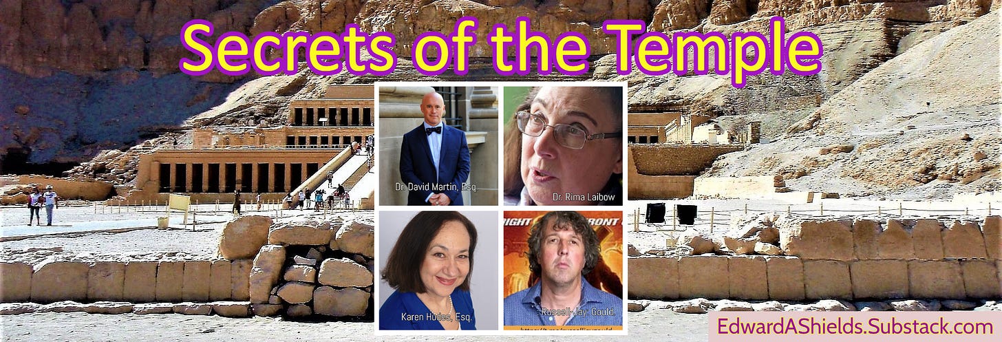 Secrets of the Temple provides an introduction to the work of Dr. David Martin, Esq., Dr. Rima Laibow, the late Karen Hudes, Esq. and the global revolutionary insights, quantum leaps, and accomplishments of : Russell-Jay: Gould. Interviews of Dr. Ana Maria Mihalcea and Dr. Bryan Ardis takes a deep look into the medical omnicide tendency and crisis of our times offering real solutions.